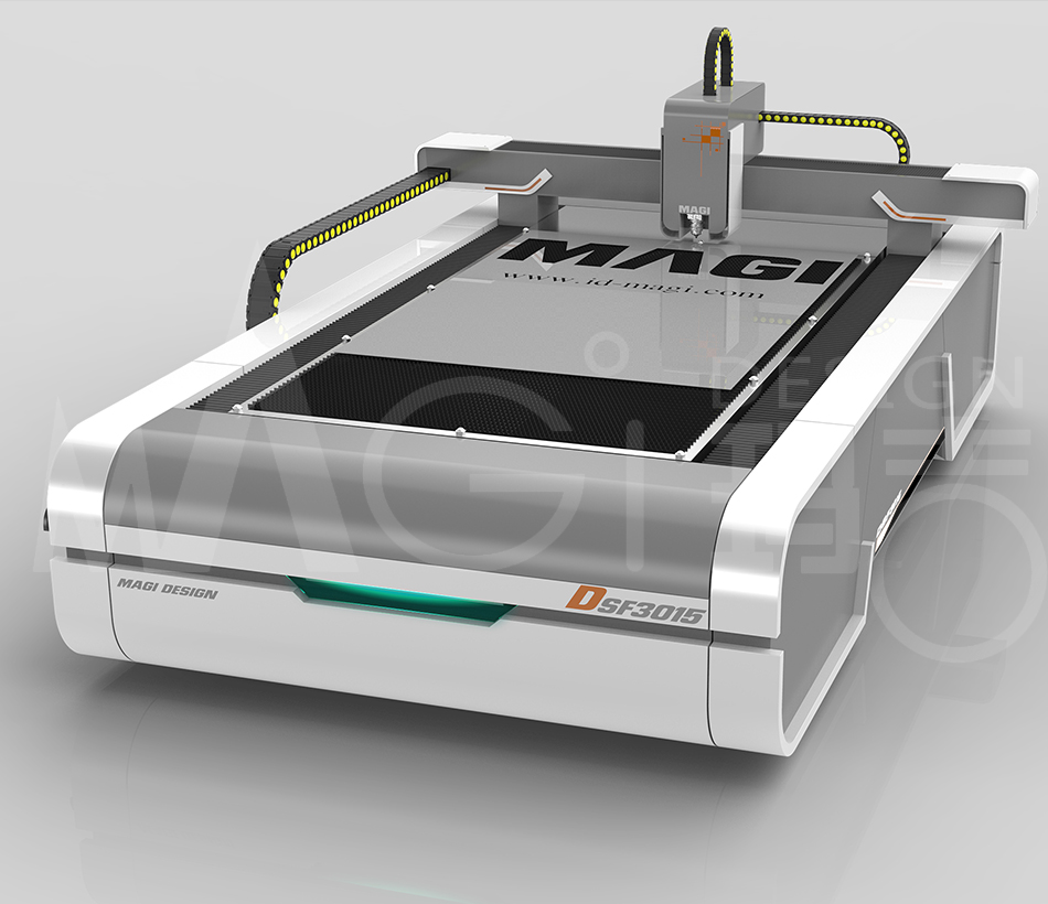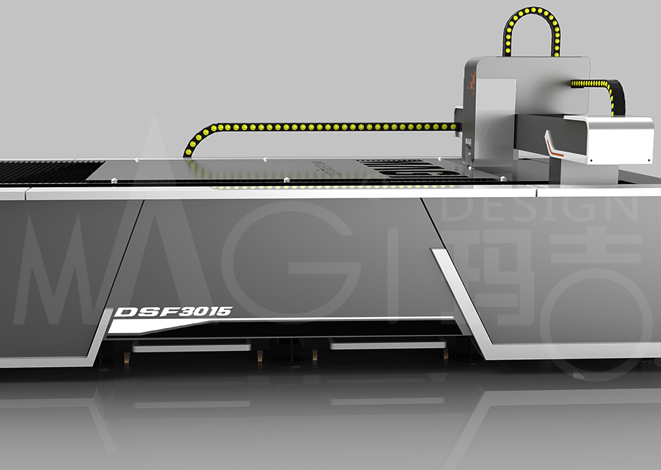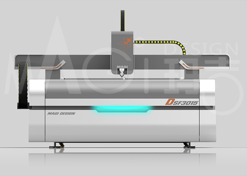 此台3015型激光切割机是为客户针对打开海外市场的一款方案,在前期,我们通过大量的前期调研和对竞争产品的系统分析研究,与客户共同确定市场定位,明确设计方向。这个项目重要的一点就是:海外市场型产品在一些方面有着严格的限制,譬如工艺、表面处理达标、考虑整机运输的尺寸限制、设备的的操作安全性、所选配件在后期维护更换的采购便利性等等。在前期通过与客户的沟通,我们认为此款产品比较容易忽略且重要的一点就是:整条产品线的定位。我们需要定义第一台出口产品的形象,它的构型、色彩、符号等,得出一个概念后为后面不断推出的其他产品作为贯穿线。